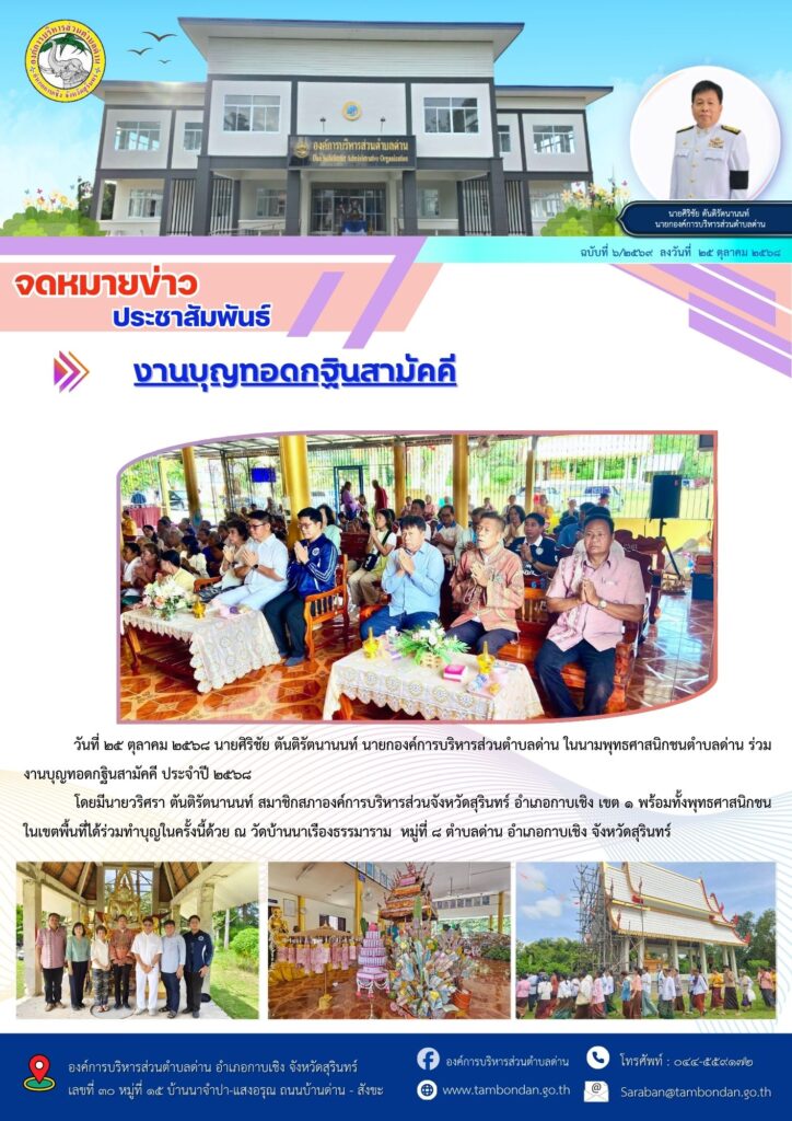ร่วมพิธีงานบุญทอดกฐินสามัคคี ประจำปี 2568 ณ วัดบ้านนาเรืองธรรมาราม หมู่ที่ 8 ตำบลด่าน อำเภอกาบเชิง จังหวัดสุรินทร์