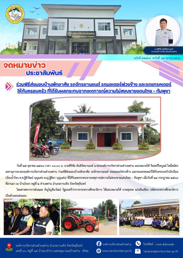 ร่วมพิธีส่งมอบบ้านพักอาศัย รถจักรยานยนต์ รถมอเตอร์พ่วงข้าง  และรถแทรคเตอร์ให้กับครอบครัวนักเรียน ที่ได้รับผลกระทบจากเหตุการณ์ความไม่สงบ ชายแดนไทย – กัมพูชา ณ บ้านโจรก หมู่ที่ 2 ตำบลด่าน อำเภอกาบเชิง จังหวัดสุรินทร์